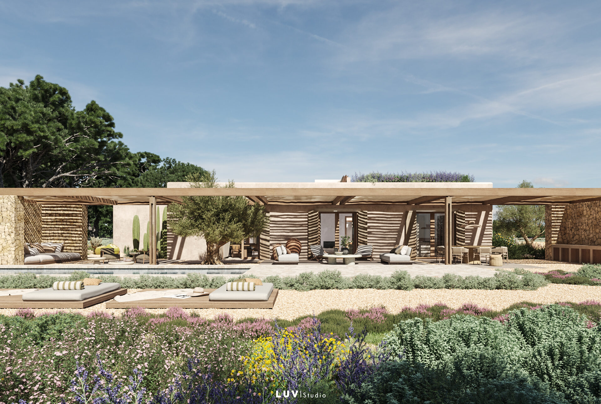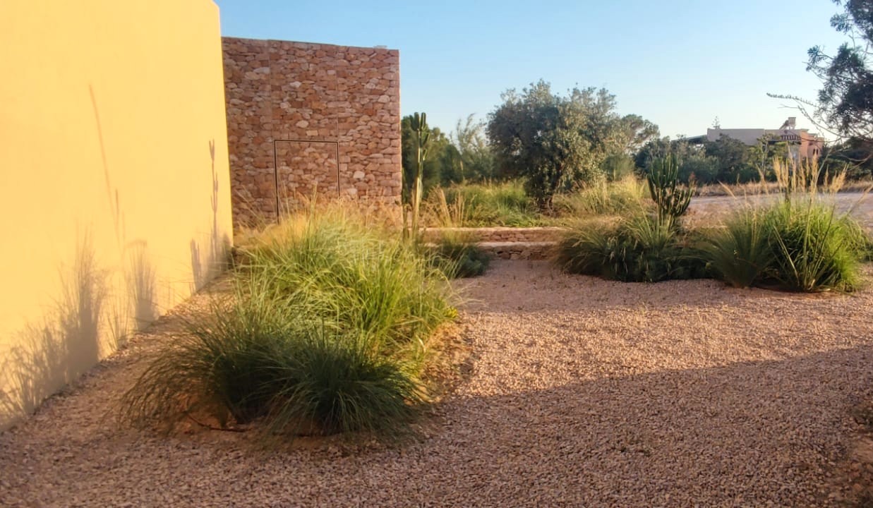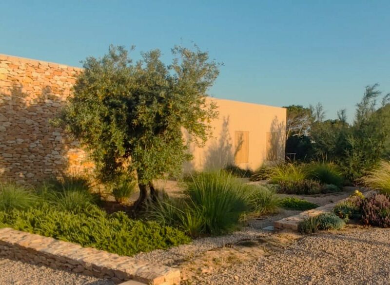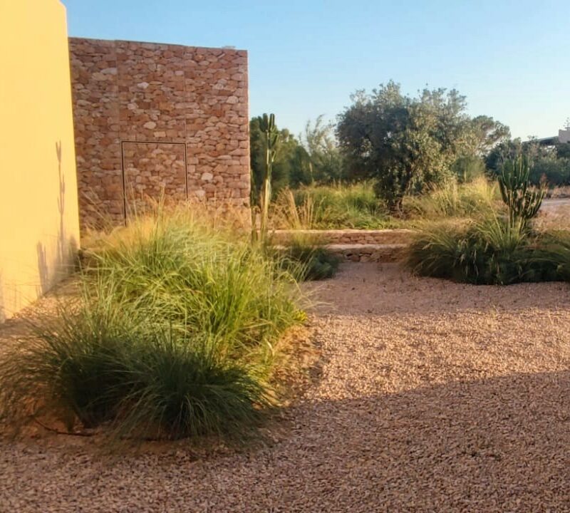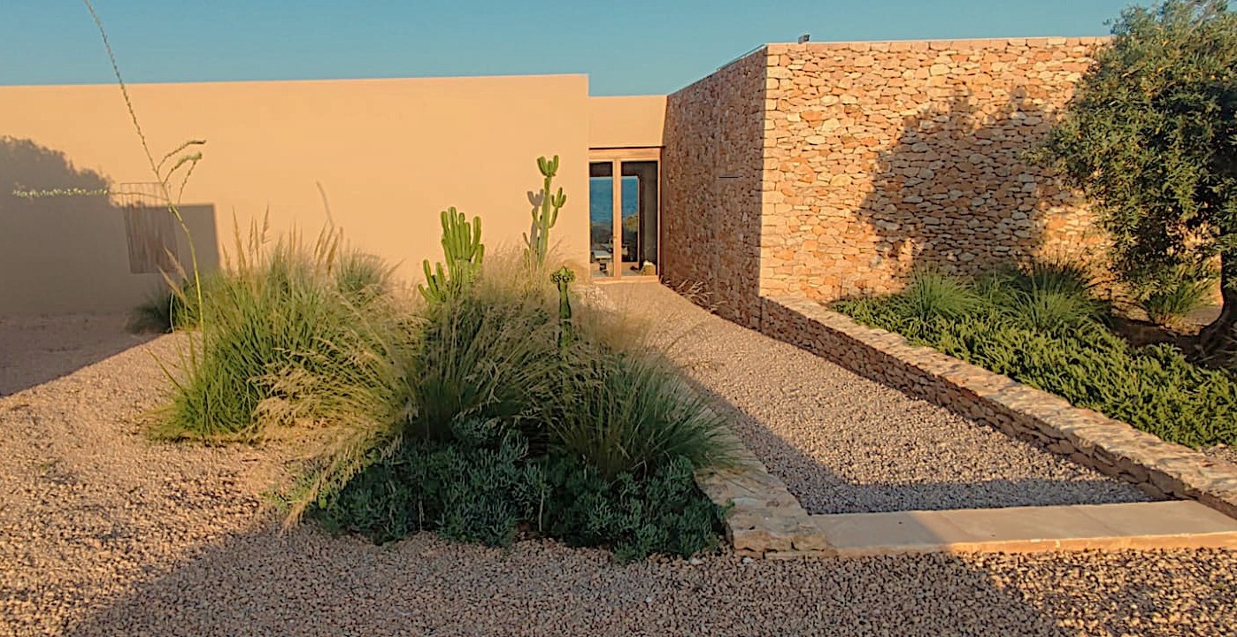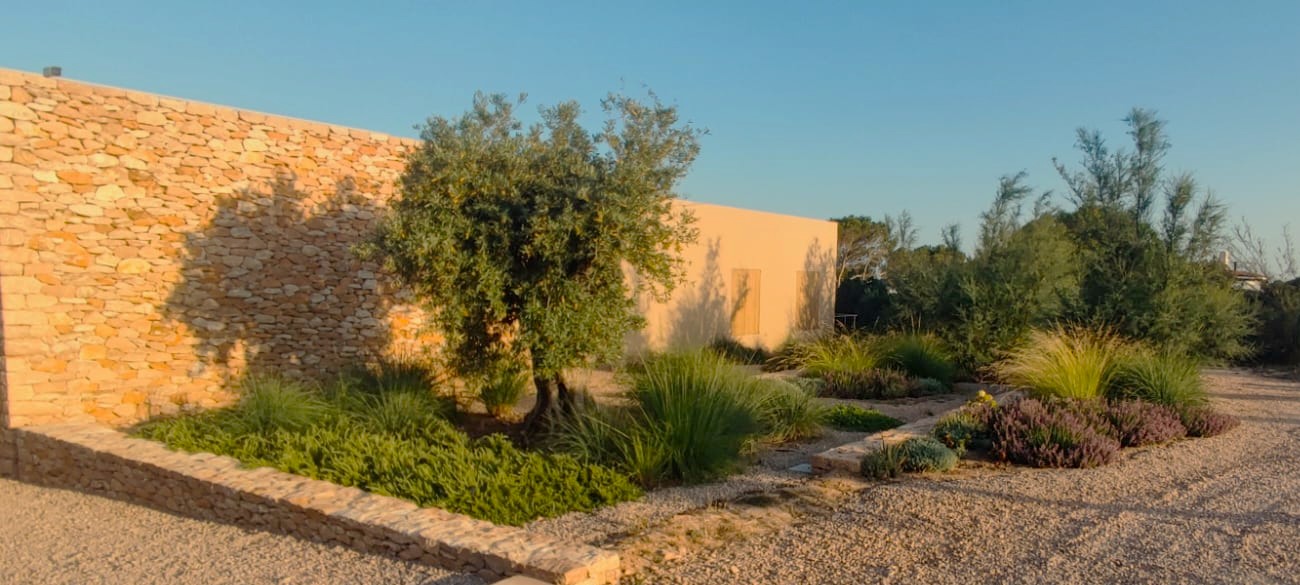 Diseñar y llevar a cabo esta obra fue todo un reto, un lienzo con unas condiciones muy peculiares y limitantes: fuertes vientos salinos, mínima capa de tierra (la roca aflora hasta la superficie) o clima con escasas lluvias y alta insolación. El objetivo era ofrecer una propuesta delicada adaptada a estos factores. Se estudió el volumen y estructura del sabinar existente para ubicar los espacios principales, recorridos y jardines secretos. Se levantaron algunos muros de piedra seca tradicional para poder añadir tierra y, donde no era posible, se propusieron especies que vivan con pocos centímetros de sustrato. El resultado es un jardín con un marcado estilo mediterráneo que se densifica en entradas, límites, parterres que rodean la piscina y terrazas exteriores, acompañan los recorridos y envuelven la magnífica Villa diseñada por LUV studio y OUA.